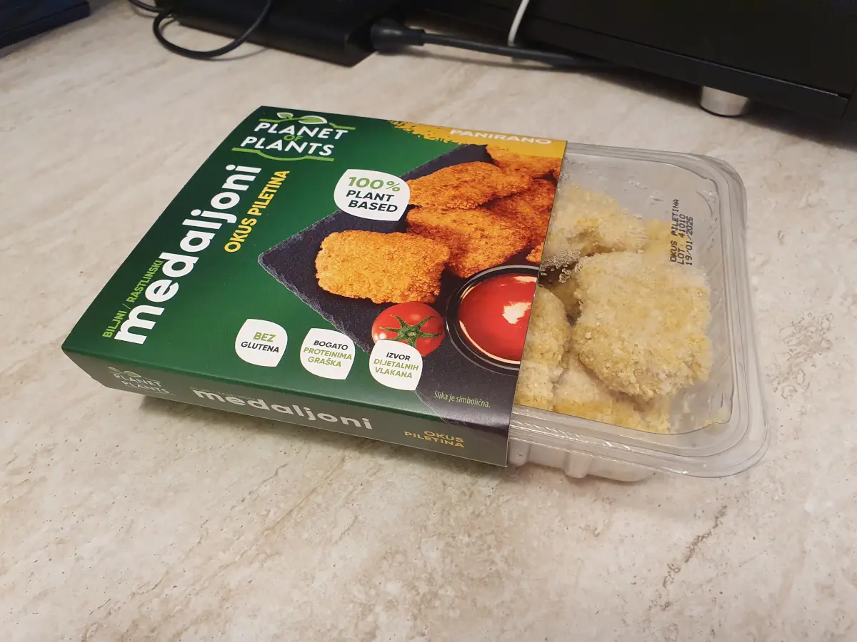 Nadjev (72 %): voda, izolat proteina graška 9,3 %, brašno graška, biljno ulje 8,1 % (suncokret, maslina), brašno riže, biljna mast 1,4 % (kokos), zgušnjivač: metil celuloza.