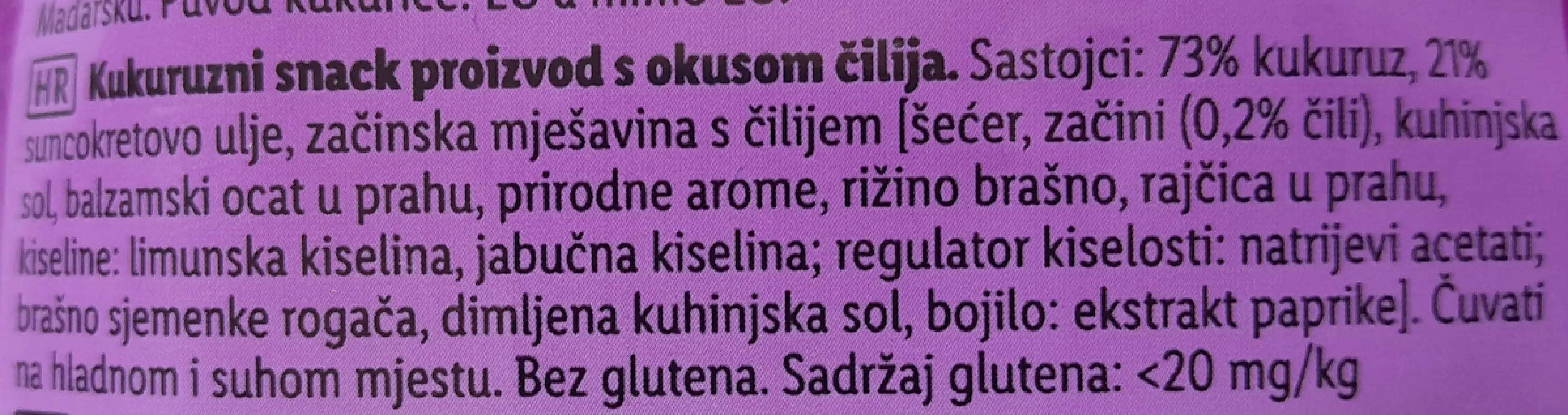 73 % kukuruz, 21 % suncokretovo ulje, začinska mješavina s čilijem (šećer, začini, 0,2 % čili, kuhinjska sol, balzamski ocat u prahu, prirodne arome, rižino brašno, rajčica u prahu, kiseline: limunska kiselina, jabučna kiselina; regulator kiselosti: natrijevi acetati; brašno sjemenke rogača, dimljena kuhinjska sol, bojilo: ekstrakt paprike).