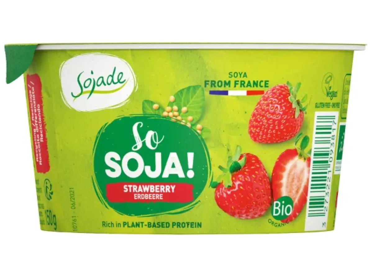 Napitak od soje* (izvorska voda, cjelovito zrno soje* 8 %), pulpa od jagode* 9 %, smeđi šećer od šećerne trske*, sirup od žitarica*, prirodna aroma jagode*, sok od bazge*, zgušnjivač: pektin, karuba guma, kalcijev citrat, regulator kiselosti: limunska kiselina. Izvorne kulture Bifidus i Acidophilus.
