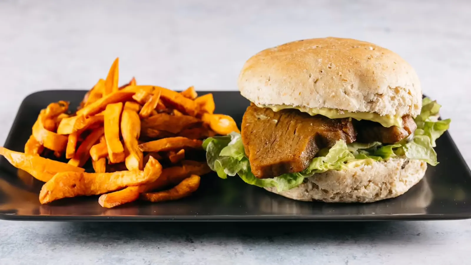 domaće integralno pecivo, seitan, tofuneza, zelena salata, kiseli krastavci