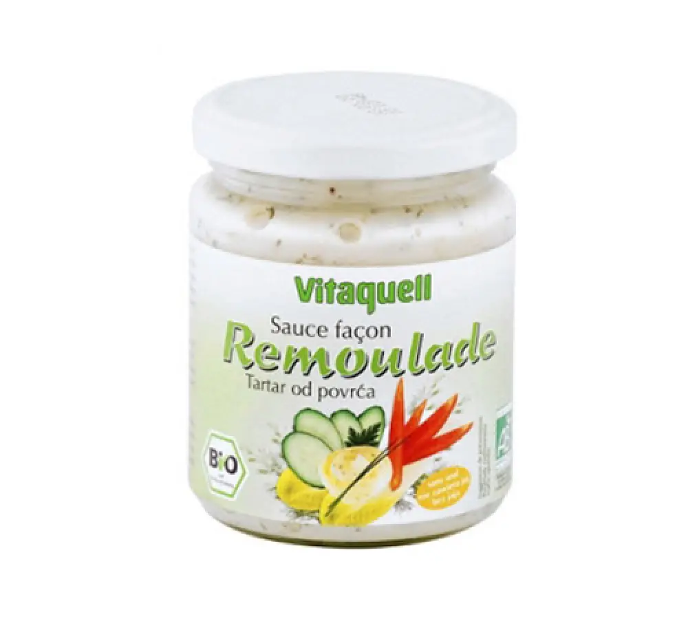 suncokretovo ulje* (50 %), voda, komadići malih kiselih krastavaca* (6 %), šećer od šećerne trske*, vinski ocat*, luk*, sjemenke gorušice*, jabučni ocat*, morska sol, proteini iz graška, glukoza, zgušnjivač: guar guma, komorač*, curry*. *Organski uzgoj