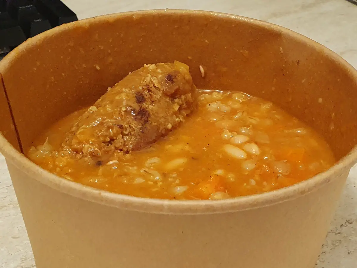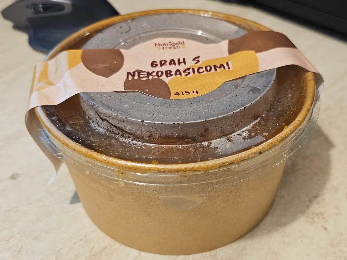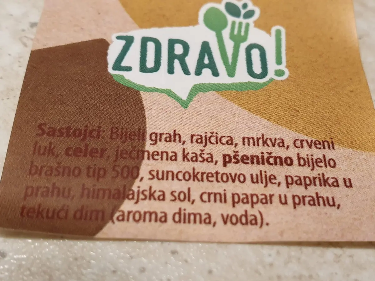 Bijeli grah, rajčica, mrkva, crveni luk, celer, ječmena kaša, pšenično bijelo brašno tip 500, suncokretovo ulje, paprika u prahu, himalajska sol, crni papar u prahu, tekući dim (aroma dima, voda).
