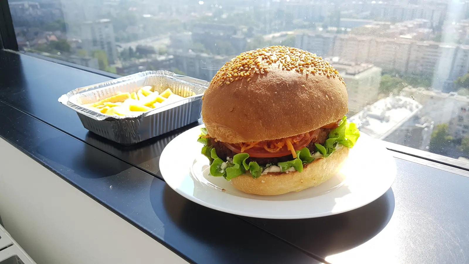 Vrhunska polpeta od koncentrata sojinog proteina, povrća i začina, dva umaka (BBQ, Vegeneza), svježe salatno povrće, burger pecivo